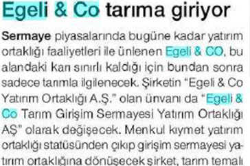 Egeli&Co. Agricultural Venture whose shares are traded on Borsa Istanbul under the code EGCYO. Agricultural Venture Capital Investment Partnership Inc. (“EGCYO” or “Egeli&Co. Agricultural Venture”) is Turkey's first and only agriculture-themed venture capital company. Founded in 1994, the company became Egeli&Co.. at the end of 2004. It was incorporated into the Financial Services Group.